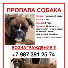 31. 03. 2026 г. с участка в д. Владимирово убежала собака. Порода: немецкий боксёр. Кличка: Шенк. С ошейником, хвост не купирован, правый глаз косит. На животе клеймо. Вознаграждение. Если кто-то видел или подобрал его, свяжитесь с нами, пожалуйста. +.. - Сергей.