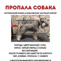 Пропала собака породы цвергшнауцер, сука, окрас соль/перец. Вознаграждение