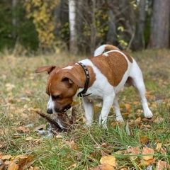 Джек Рассел терьер, мальчик. Кличка Тор, откликается на тортик. Очень похож на Майло из фильма маска. Темно коричневый, кожаный ошейник