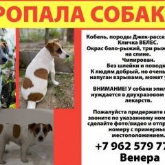 Кобель, породы Джек-рассел-терьер. Кличка ВЕЛЕС. Окрас бело-рыжий, три рыжих пятна на спине. Чипирован. Без шлейки и поводка. К людям добрый, но очень сильно напуган взрывами, может убегать. ВНИМАНИЕ У собаки эпилепсия, нуждается в двухразовом приеме лекарств. Пожалуйста придержите и сразу звоните по указанному номеру. Или сделайте фото/видео и отправьте по номеру с примерным местоположением.. Венера