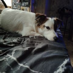 Выскочила за ворота, средний рост, шерсть белая с рыжим, на одном глазу чёрная пятнышко шерсти, очень трусливая, может где-нибудь забиться и спрятаться