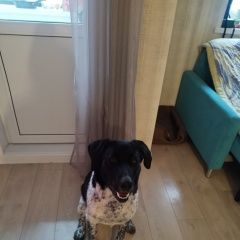 31. 10. 2025 В Сколково, Московская область Найдена собака, девочка без чипа, чёрная морда, тело с белыми пятнами, в коричневом ошейнике, собака ласковая, контактная.