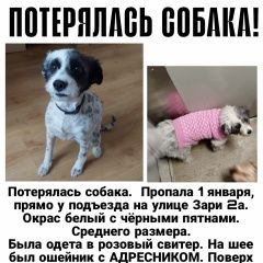 Потерялась собака. Пропала 1 января, прямо у подъезда на улице Зари 2а. Окрас белый с чёрными пятнами. Среднего размера. Если вы её хоть где-то видели, пожалуйста, напишите. Любая информация нам очень важна. Возможно собаку украли.