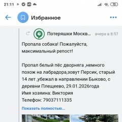 Объявление о том, что пропала собака размещено в соцсетях: