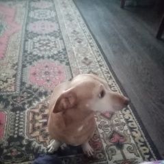 Метис таксы, зовут Фантик, рыжий, мордочка седая, белый галстучек.