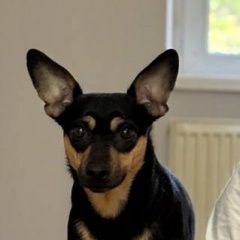 Черная с рыжими пятнами. Примерно по колено взрослого человека (50 см). Откликается на имя Буся, добрая/ласковая (Прижимается к земле и машет хвостом)